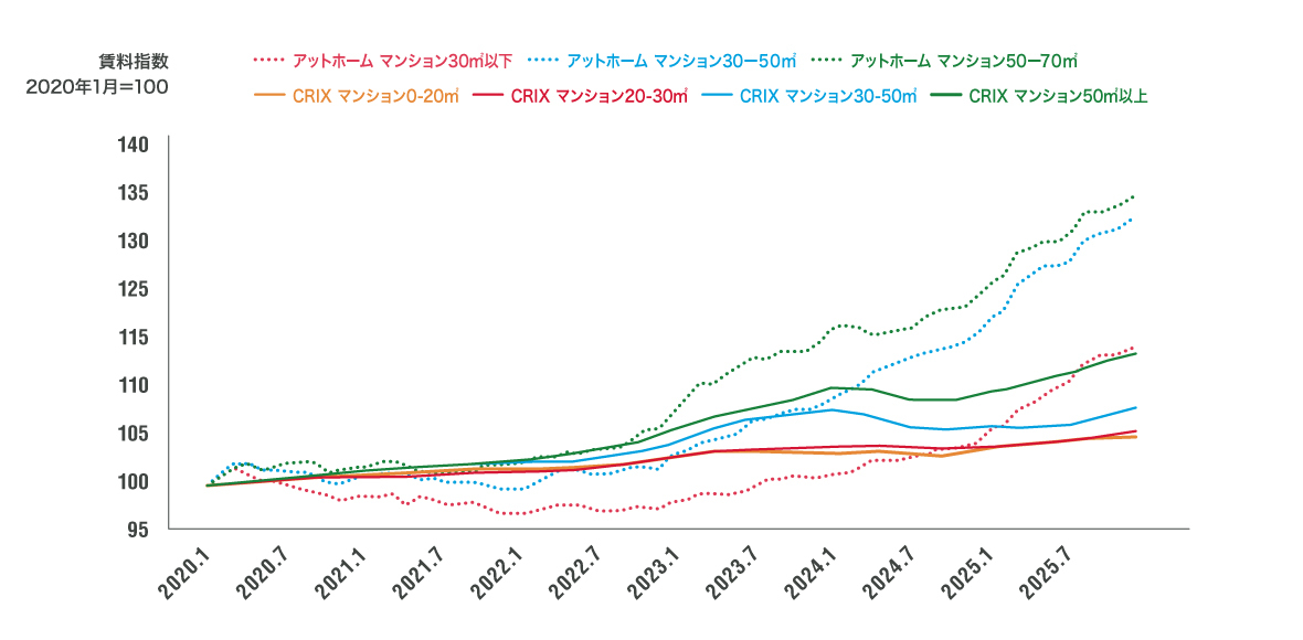 2025年11月時点の「募集賃料」は2020年1月比で、単身者向け(30㎡以下)が+16.65%(3.33%/年)、カップル向け(30-50㎡)が+32.13%(6.43%/年)、家族向け(50-70㎡)が34.50%(6.90%/年)上昇しており、いずれも物価上昇率を上回っています。このため、多くのメディアが東京23区の賃貸マンションの賃料が高騰していると報じています。