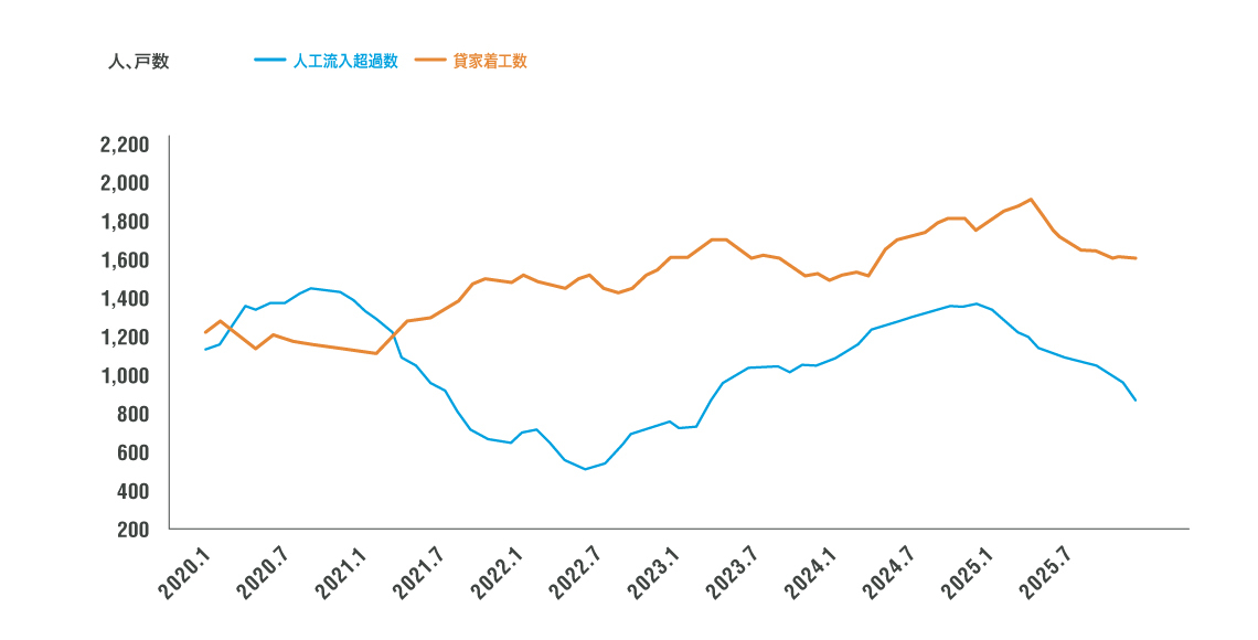 新型コロナウイルス感染拡大の影響で、人口の流入超過数が減少したのに対し、貸家着工数は増加傾向で推移していたことがわかります。両者の差は2022年6月に最大となり、その後は2024年11月にかけて縮小し、2025年は再び拡大傾向で推移しています。賃貸住宅の建替えもありますので、両者の差がそのまま需給の差であると一概には言えませんが、大阪市の賃貸住宅市場は若干供給過剰である可能性があります。