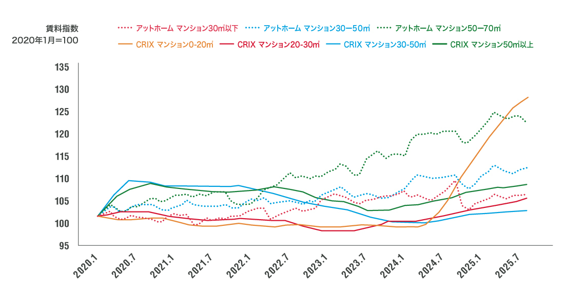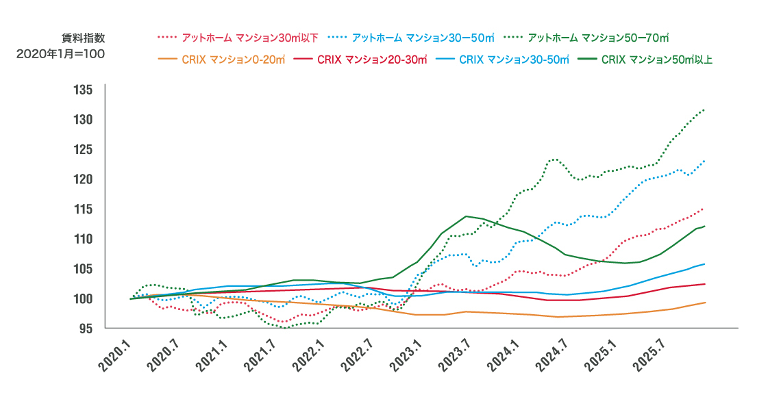 これに対して「支払い賃料」は、コロナ禍中は横ばいから微増で推移しています。これは、コロナ禍中は賃料の低いテナントが退出していたことを示しています。需給ギャップの拡大を受けて、物件数の多い単身者向け(0-20㎡、20-30㎡)の「支払い賃料」は低迷しています。2025年11月時点の2020年1月比の「支払い賃料」の上昇率は、面積の狭い0-20㎡は▲0.5%(約▲0.1%/年)と下落しています。また、20-30㎡は+ 2.7%(約+ 0.4%/年)の上昇にとどまっています。