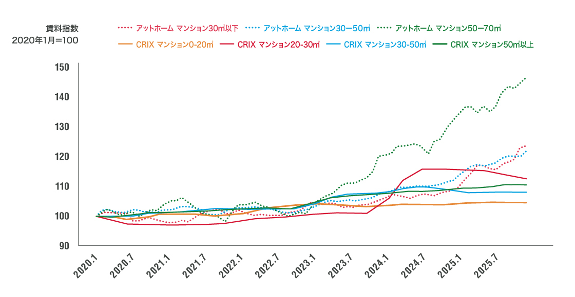 2020年1月に対する2025年11月の「募集賃料」の上昇率は、単身者向けの30㎡以下が+23.8%(約+4.0%/年)、カップル向けの30-50㎡が+21.8%(約+3.6%)、家族向けの50-70㎡が+46.7%(約+7.8%/年)であり、分譲マンションの高騰から需要が高まり、かつ供給量の少ない家族向け物件の「募集賃料」の上昇幅が高くなっています。