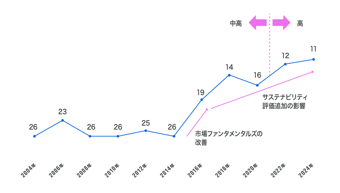 なお、2016年に日本の透明度順位が大きく上昇したのは「市場ファンダメンタルズ」が改善したこと、2018年度以降の上昇は透明度のサブインデックスに「サステナビリティ」が加えられたことが要因です。