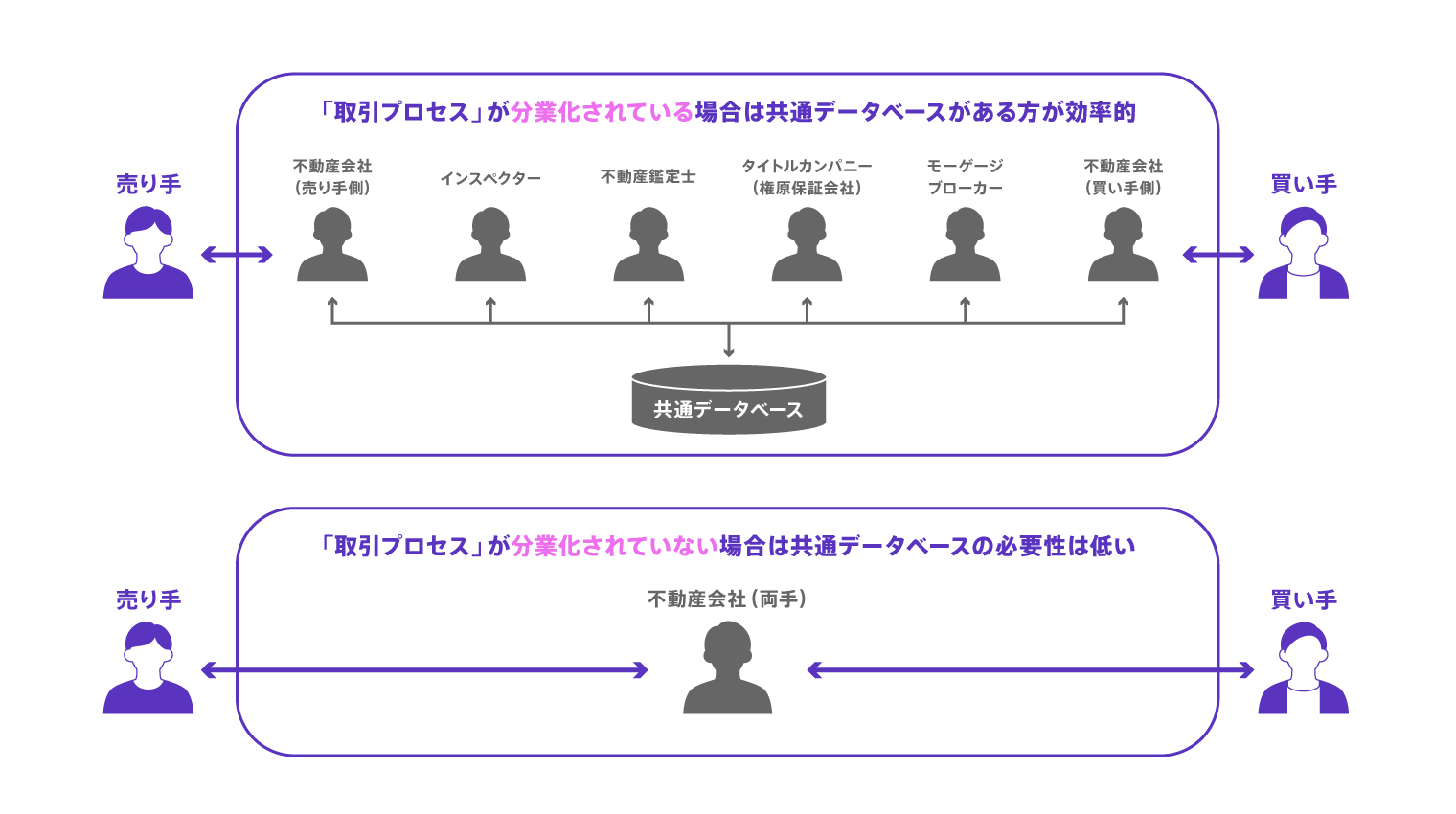 日本の情報開示が進まない理由の1つとして、不動産の取引に介在する関係者が少ないことが考えられます。例えば、米国の住宅不動産取引では、売り手側、買い手側双方の不動産業者(エージェント)、契約手続きを管理するエスクロー会社、物件調査を行うインスペクター、価格を査定する不動産鑑定士、権利関係を確認するタイトルカンパニー、契約書を確認する弁護士、ローンを提案するモーゲージブローカーなど、多くの関係者が分業する仕組みが確立しています。これらの分業をスムーズに行うためには、物件情報が公開されていたほうが都合がよいのです。