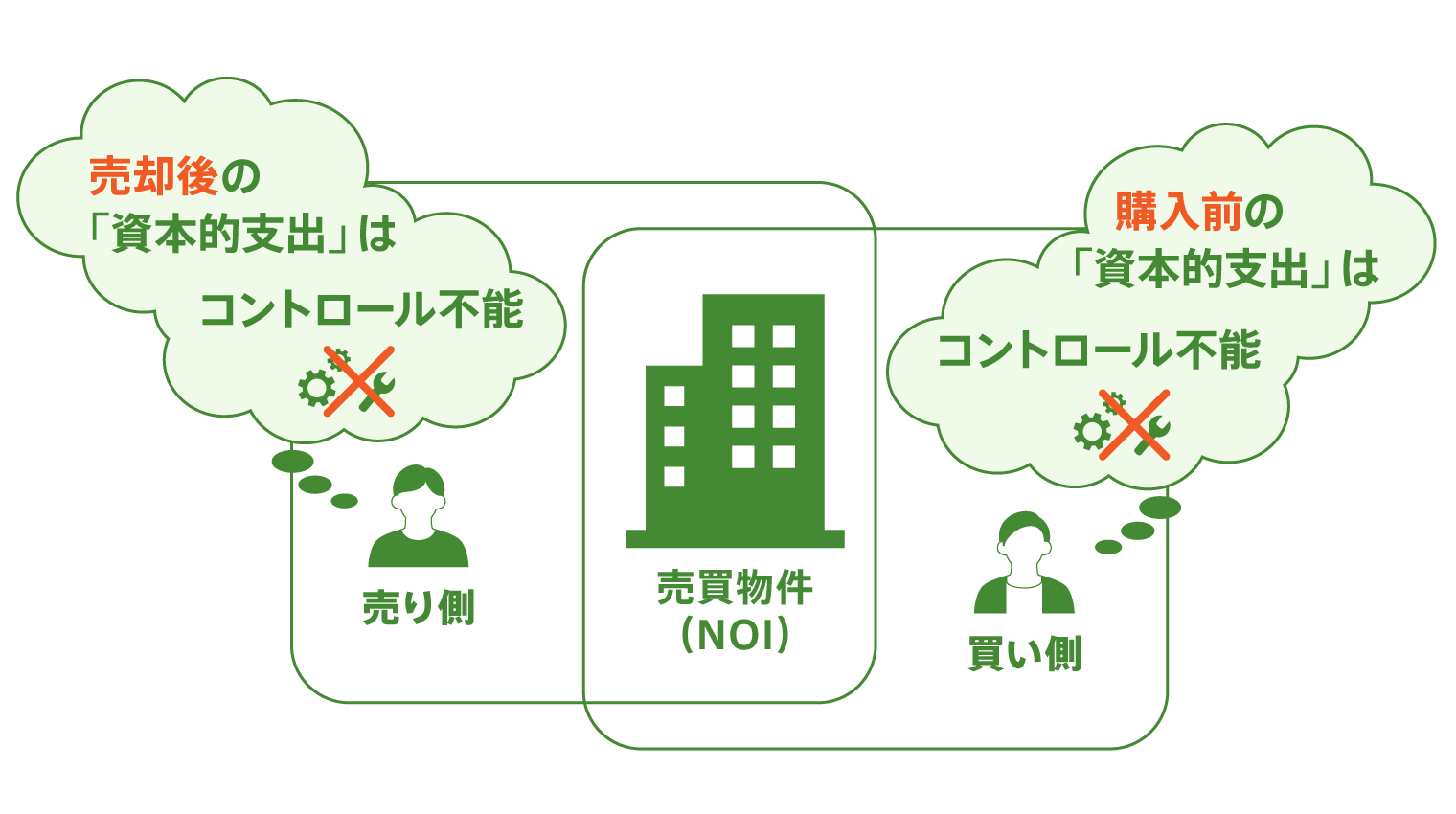 図2:売買物件の「資本的支出」は売り側・買い側ともにコントロール不能→運営純収益(NOI)を採用