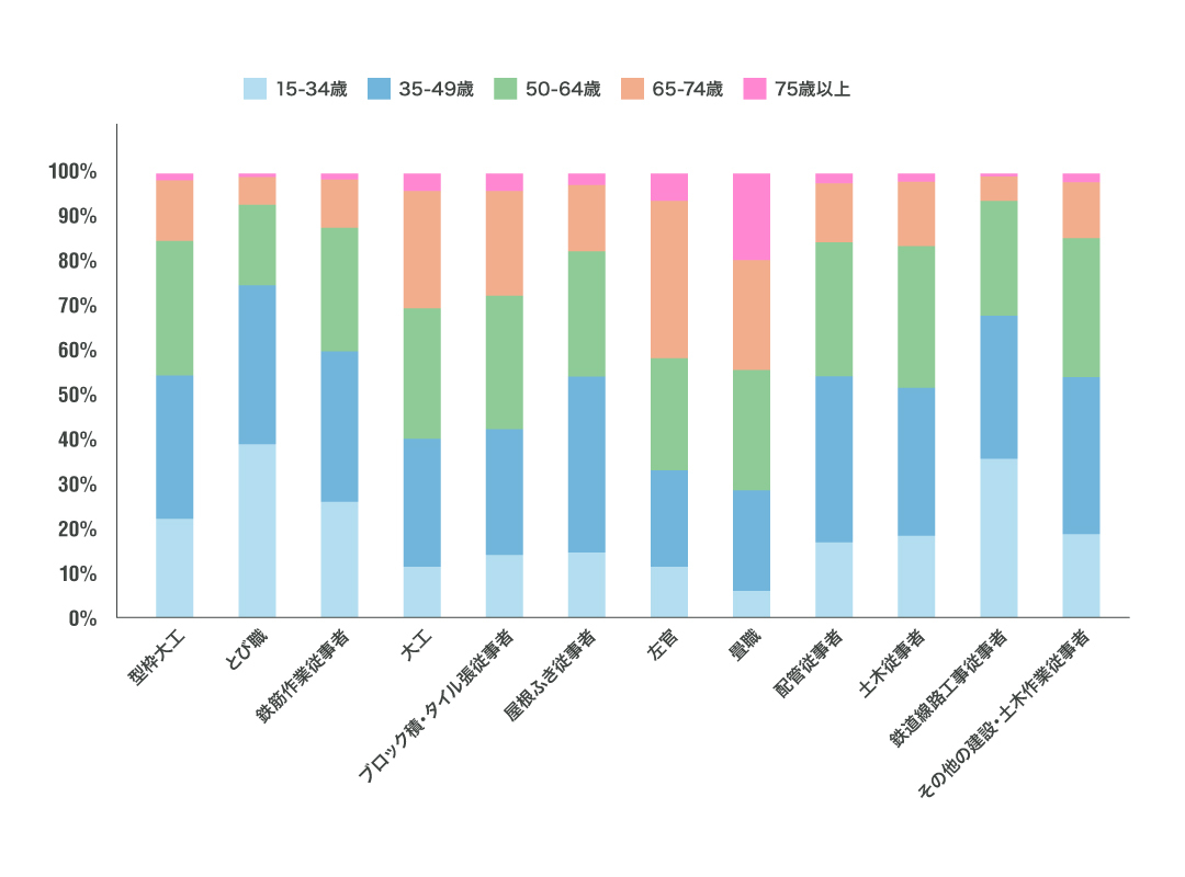 範囲を高齢者予備軍の高年層まで広げてみましょう。前述した4つの職業は「畳職」(71.4%)、「左官」(66.9%)、「大工」(59.8%)、「ブロック積・タイル張従事者」(57.5%)と非常に高い割合となります。「とび職」と「鉄道線路工事従事者」を除く10職業で比率が40%を超えています。そして、「畳職」以外の職業の後期高齢者の割合が低いことから、多くが今後20年以内に引退すると考えられます。