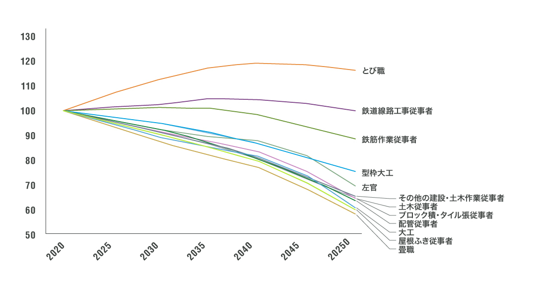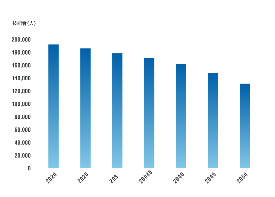 機械化などでカバーできる部分もあると思いますが、これらの工事を担う「技能者」(職人)数の減少が、施工能力の減少に大きく影響すると考えられます。