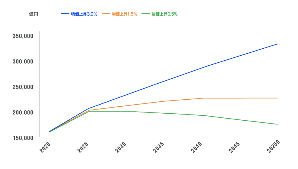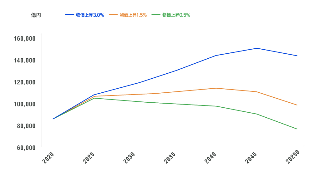 非木造建物への投資は、物価上昇率が3%の場合は同+106%の約33.6兆円、物価上昇率が1.5%の場合は同+41%の約23.0兆円、物価上昇率が0.5%の場合は同+9%の17.7兆円です。